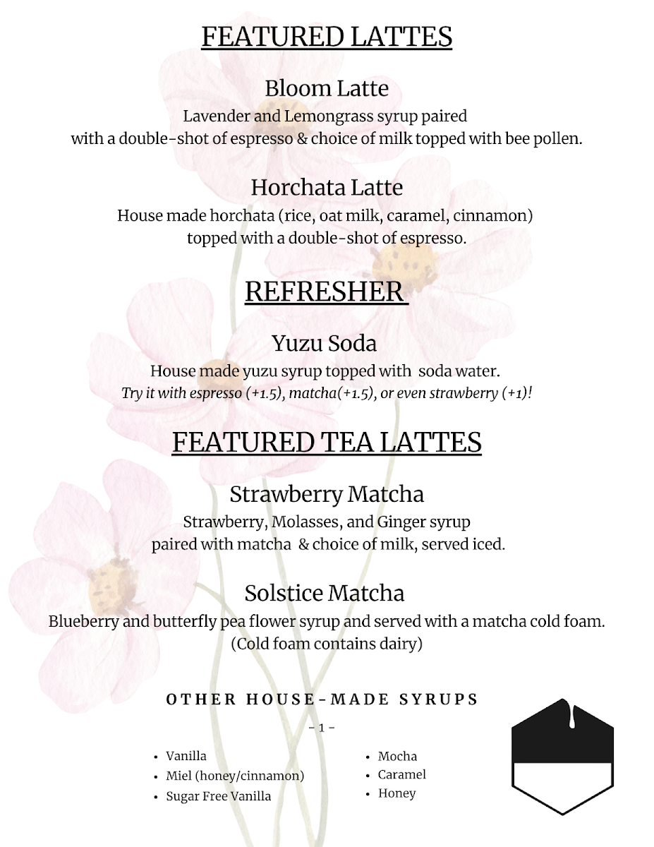 Lavender and Lemongrass syrup paired with a double-shot of espresso & choice of milk topped with bee pollen.